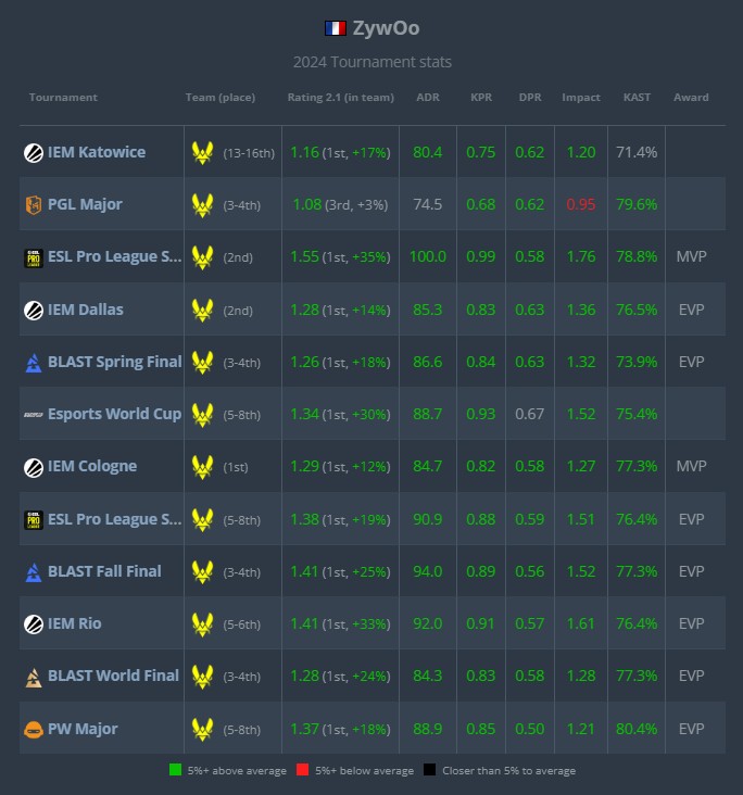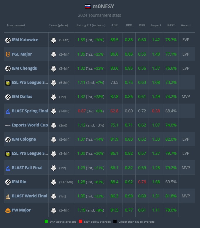 载物在2024年收获2个MVP头衔,MVP总数仅比s1mple(21个)少1个,此外还有7个EVP进账,平均Rating达到1.35。